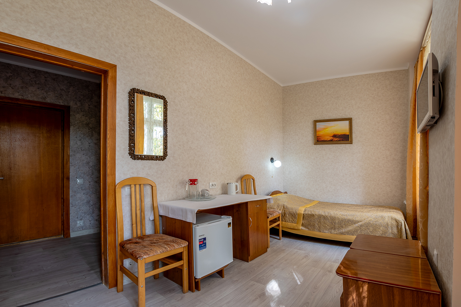 На небольшой площади есть всё необходимое: две кровати (90*200 см)с прикроватными тумбочками, стол со стульями, телевизор, зеркало, холодильник, чайник. В номере есть балкон.